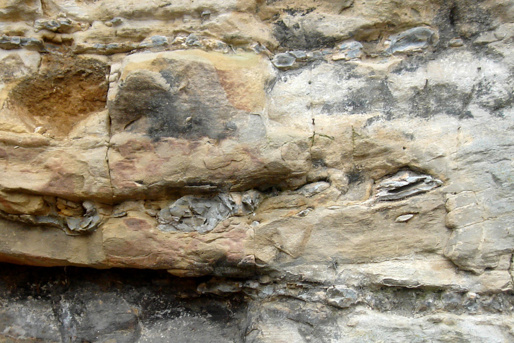 Stratification oblique soulignée par des lits de silex à la base du front de taille, près de l’entrée du parking.