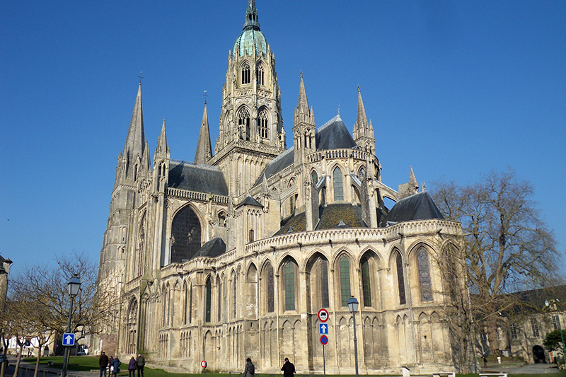 La cathédrale de Bayeux, capitale du Bessin, est construite en pierre de Creully, associée à la pierre de Caen.