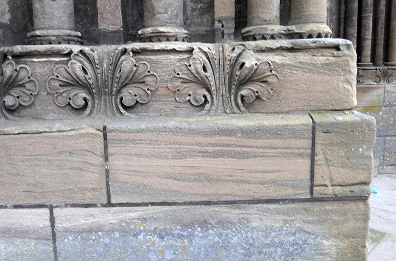 Dans le socle des colonnettes encadrant les portes, la pierre de taille présente le litage caractéristique du Calcaire de Creully. |