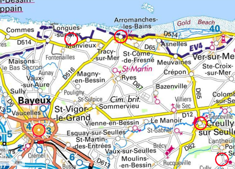 Carte partielle du Bessin : Localisation de bâtiments en pierre de Creully, de Bayeux à Arromanches