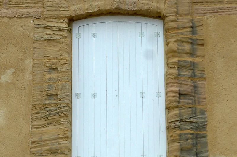 Au-dessus de la porte, les pierres de l’arc de voute ont été taillées dans le Calcaire de Creully. Le litage a été disposé perpendiculairement à l’arc pour une meilleure tenue. |