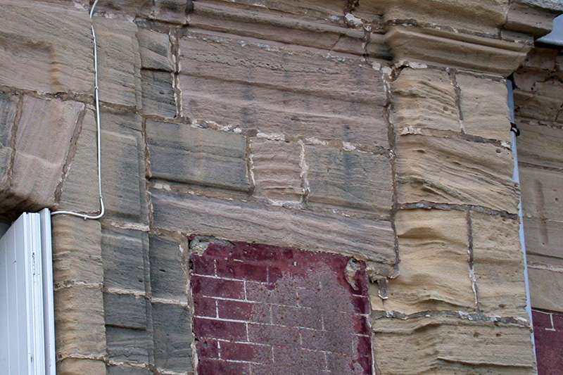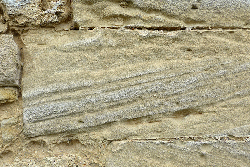 La pierre de Creully est dégradée par l’érosion différentielle. Des pierres exogènes (travertin ?) plus grises et résistantes ont été intégrées au mur.