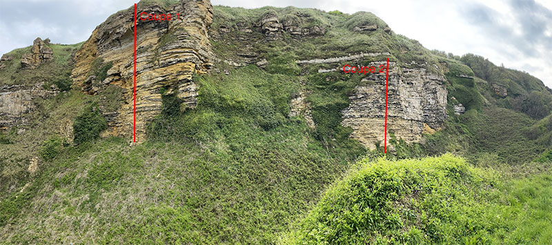 Emplacement des coupes 1 et 2 sur la falaise en place de Longues