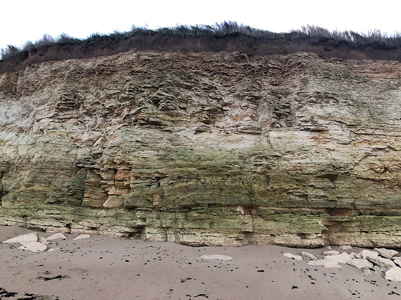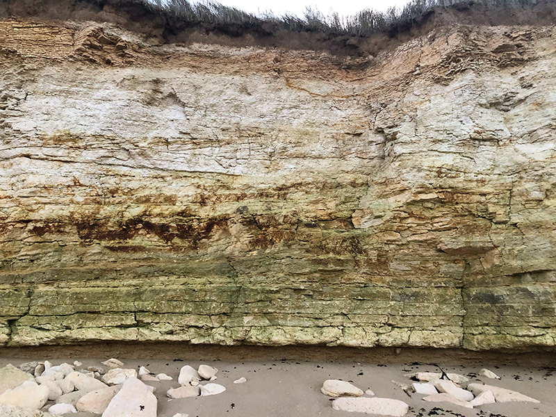 La Formation du Calcaire de Langrune du Bathonien supérieur affleure dans la falaise côtière. |