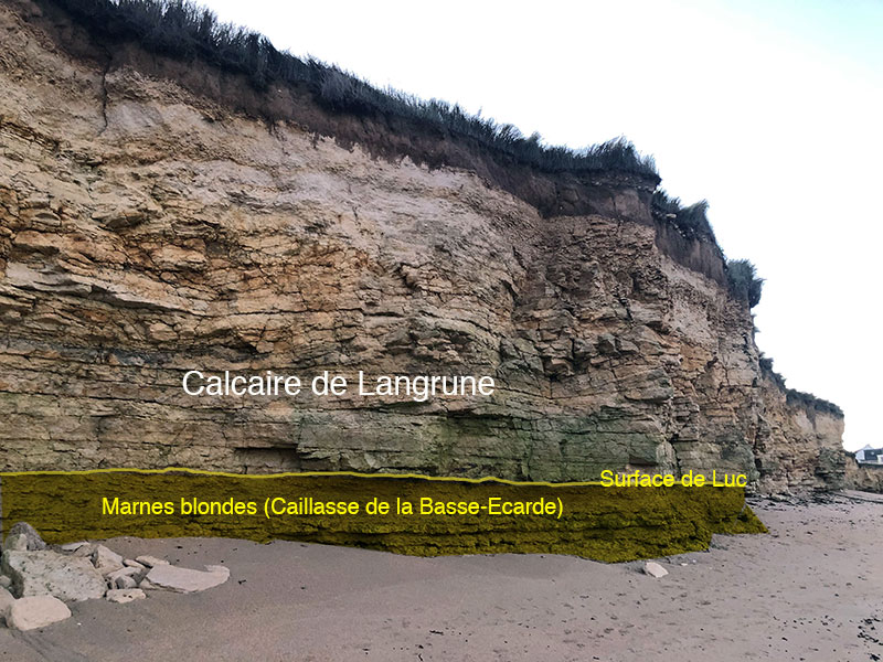Au dessus de la Surface de Luc, la Formation du Calcaire de Langrune, résistante à l'érosion, est ici visible en relief à quelques décimètres du sable de la plage. Elle surplombe les Marnes blondes, moins rigides, appartenant à la Formation des Caillasses de la Basse-Ecarde. |