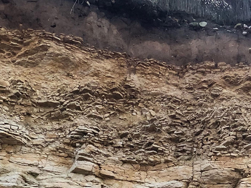 Le sommet de la Formation du Calcaire de Langrune est ici fortement fracturé en raison de la cryoturbation subie au cours des phases de glaciation du Quaternaire.