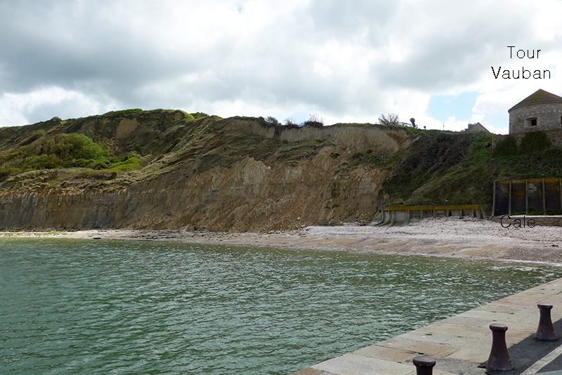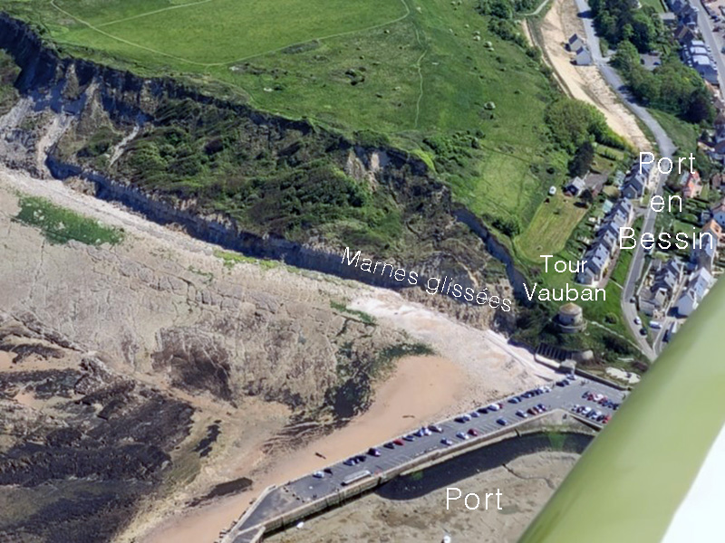 Glissement dans les Marnes de Port Ce glissement s’est produit au printemps 2025 à proximité de la tour Vauban qui domine la partie Est du port. Il affecte les marnes des membres moyen et supérieur de la Formation des Marnes de Port (Bathonien). |