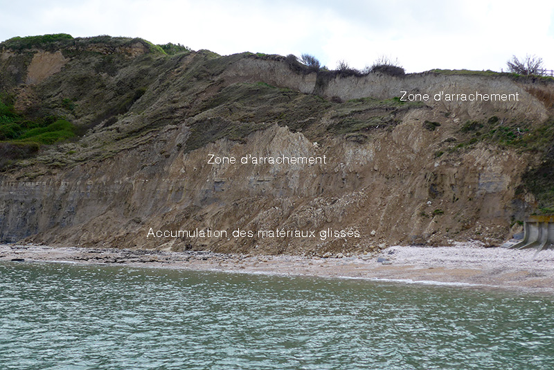 Les marnes ont glissé depuis les zones d’arrachement situées au sommet et à mi-hauteur de la falaise jusque sur l’estran où elles se sont accumulées. Elles masquent la base verticale de la falaise, constituée par le premier membre des Marnes de Port, et elles recouvrent les couches de passage (Bathonien) situées au sommet des Calcaires à spongiaires (Bajocien). Les matériaux accumulés seront rapidement déblayés par la mer. |