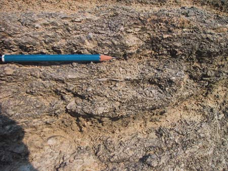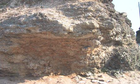 A l'extrémité ouest de la falaise, de part et d'autre du chemin des mouliers, affleure un calcaire bioclastique grossier à bryozoaires. Ce calcaire bioclastique surmonte les biohermes à spongiaires qui émergent du sable de la plage de quelques dizaines de centimètres (ici à mi-hauteur de la photo). |