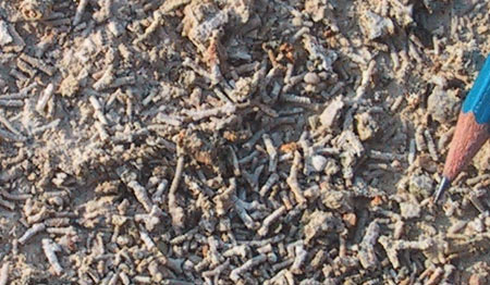 Le calcaire bioclastique résulte de la consolidation d'un sable grossier. On peut y observer des fragments de bryozoaires, très abondants, ainsi que de nombreux débris coquilliers variés. |