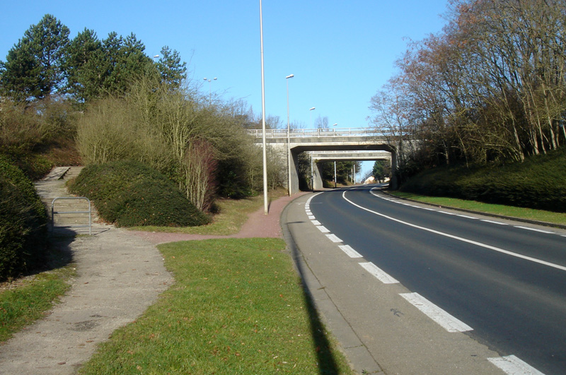 En venant du Mémorial par la rue de Roquemonts, on peut accéder à l’affleurement en suivant une allée qui rejoint l’avenue de Courseulles par un escalier. |