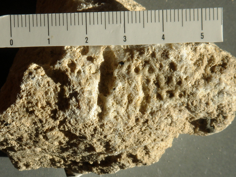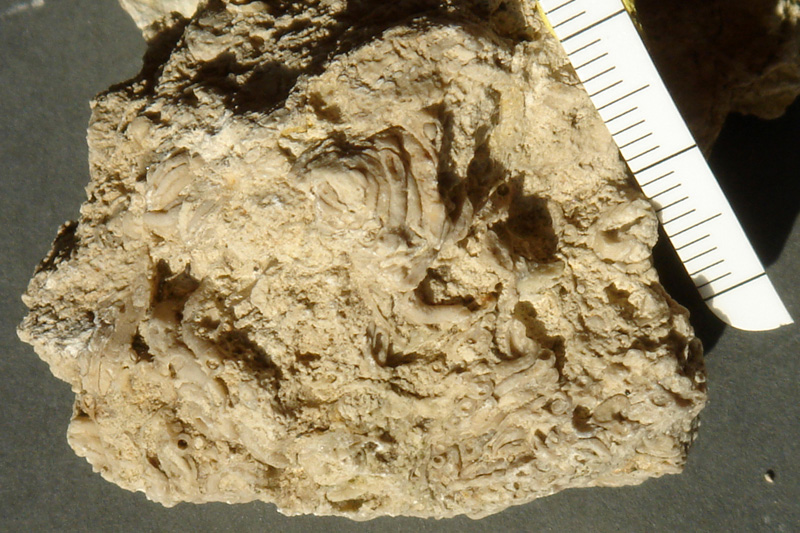 Le calcaire qui affleure ici est dur, très compact et mal stratifié, il s’agit d’un calcaire construit à polypiers et stromatopores (visibles en section à la loupe). De telles constructions récifales, de petite taille, sont localisées dans la partie supérieure de la Formation du Calcaire de Blainville.