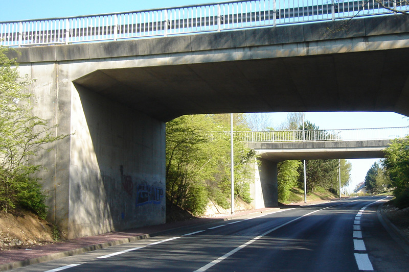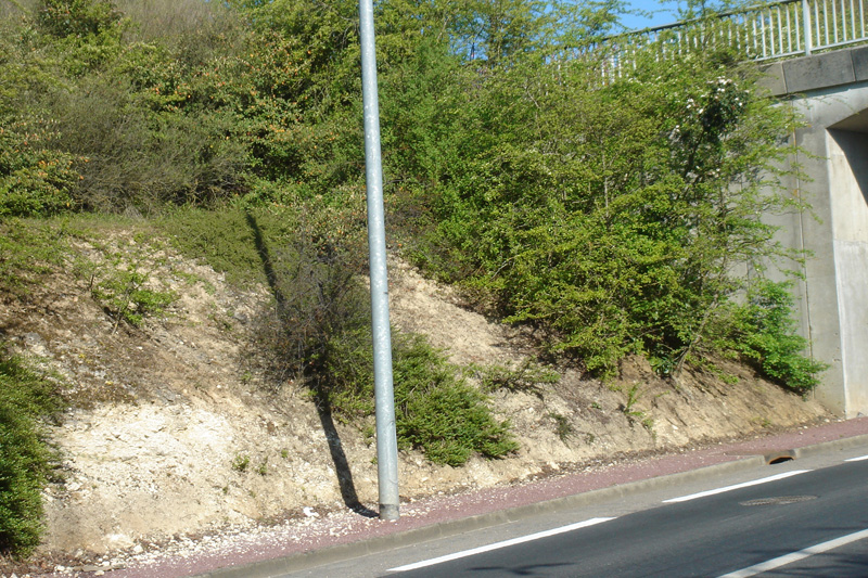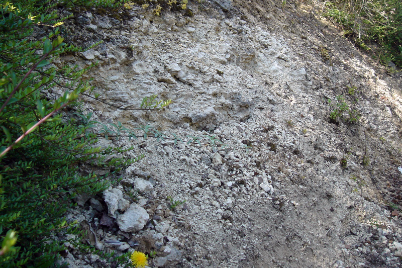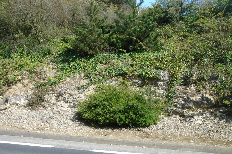 De l’autre côté de l’avenue, le calcaire présente les mêmes caractéristiques sous sa patine grise : blanc à la cassure, dur et mal stratifié. L’affleurement est plus ou moins masqué par la végétation en fonction des travaux d’entretien et selon la saison.