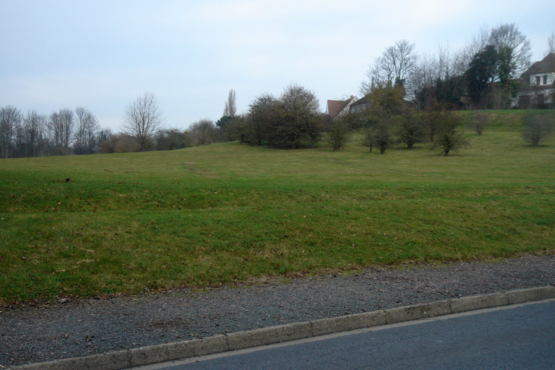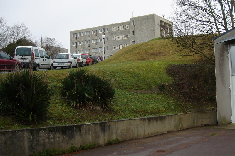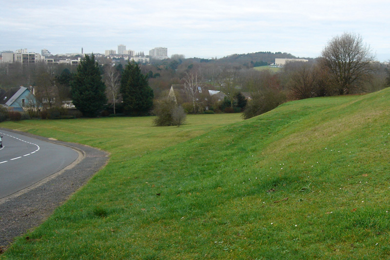 Le Calcaire de Blainville se prolonge vers l’ouest sous le Mémorial pour la paix (bâtiment rectangulaire en arrière-plan à droite) et la Colline aux Oiseaux, jusque sous le quartier du Chemin Vert (groupe d’immeubles à l’horizon).