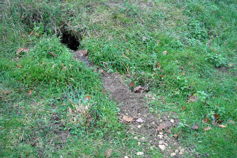 Ce terrier a été creusé dans un niveau peu cohérent et sableux du Calcaire de Blainville ; des fragments de calcaire ont été rejetés avec la terre déblayée. |