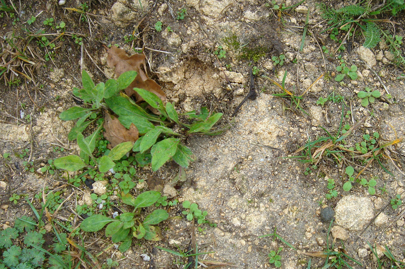 Les oolithes mélangées à la terre du sentier trahissent la présence sous-jacente du Calcaire de Blainville.