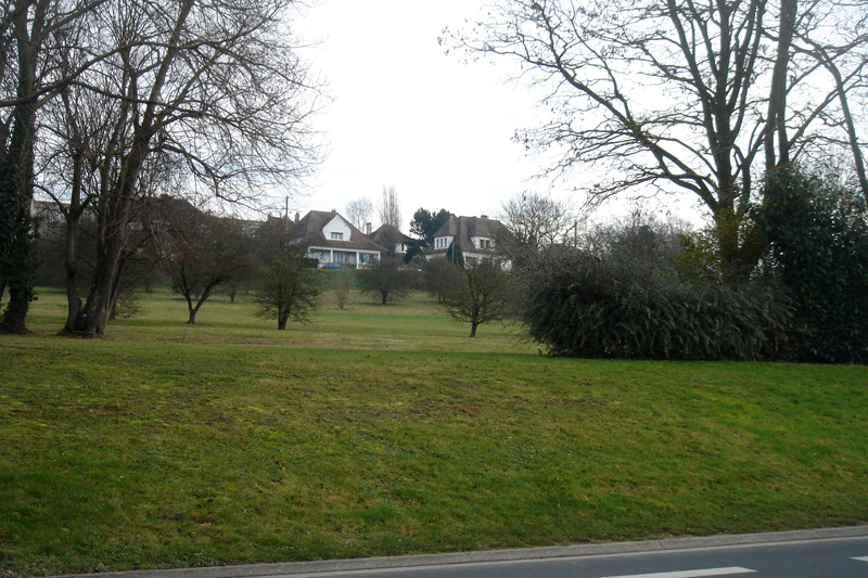 Le Calcaire de Blainville du coteau des Sablons, au premier plan, surmonte le Calcaire de Creully de la Vallée des jardins située en contrebas au-delà des maisons qui bordent l’avenue de Courseulles.