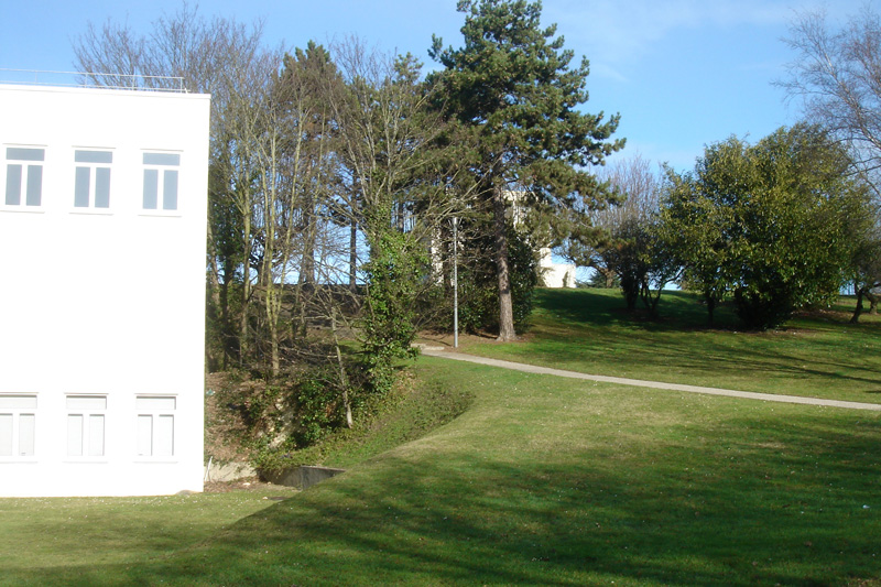 De couleur blanche, le Calcaire de Blainville affleure à droite du bâtiment de Morphologie Continentale et Côtière (M2C). Il se prolonge derrière le bâtiment dans un ancien front de taille d’environ 5m de hauteur envahi par le lierre.