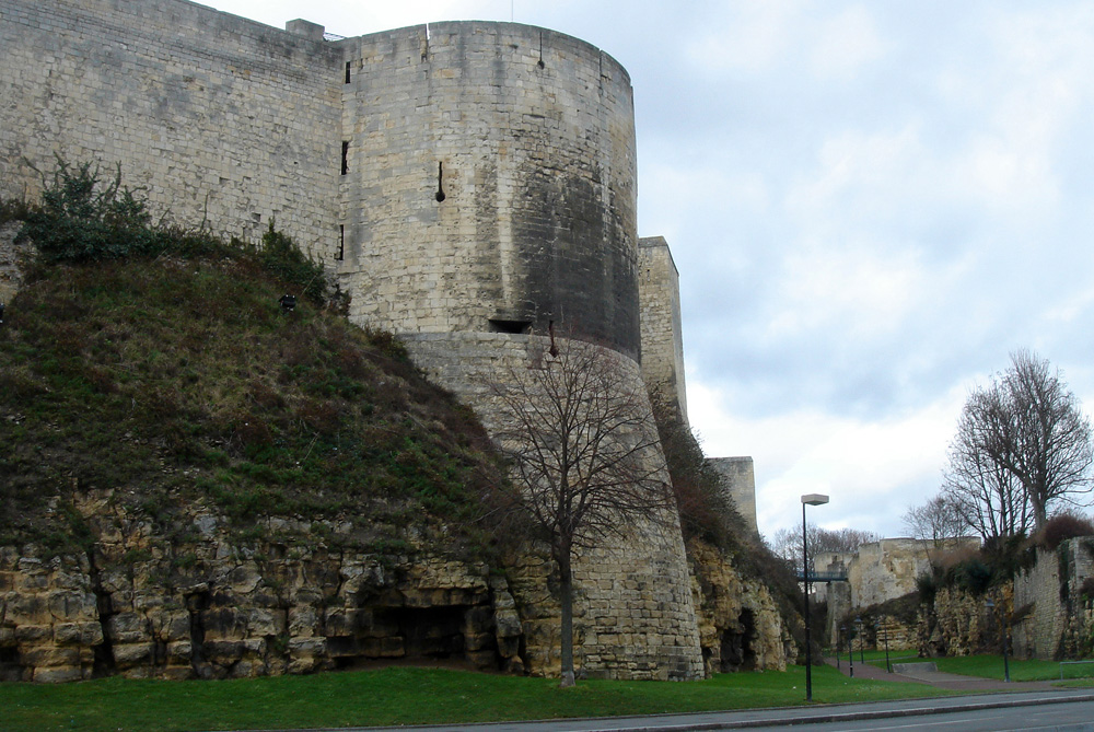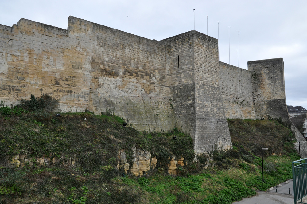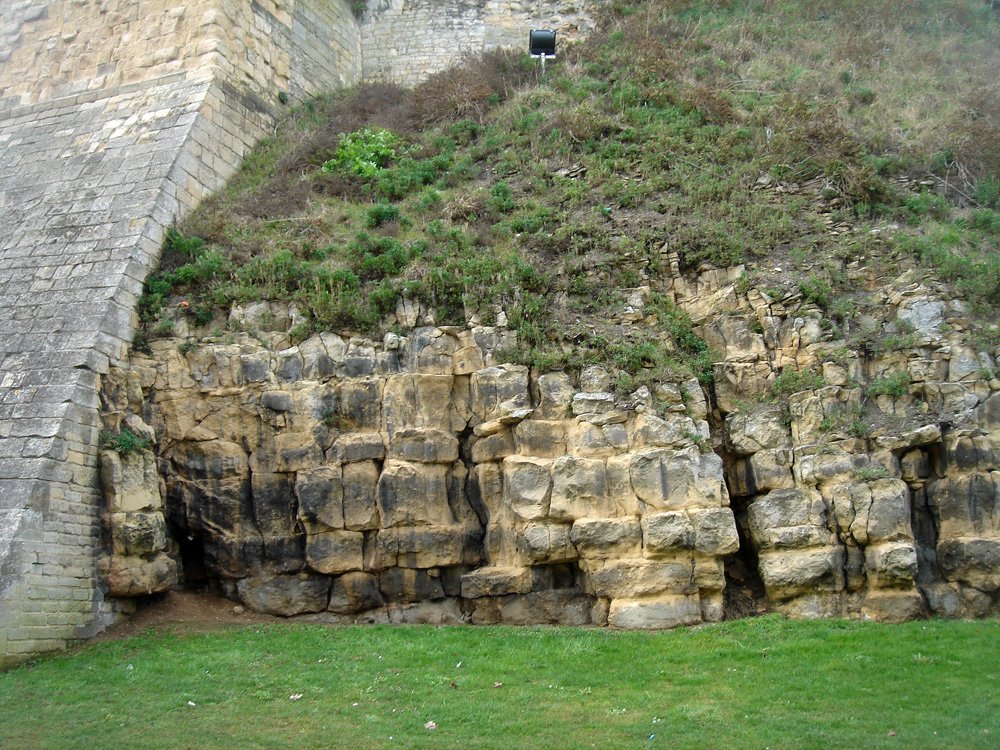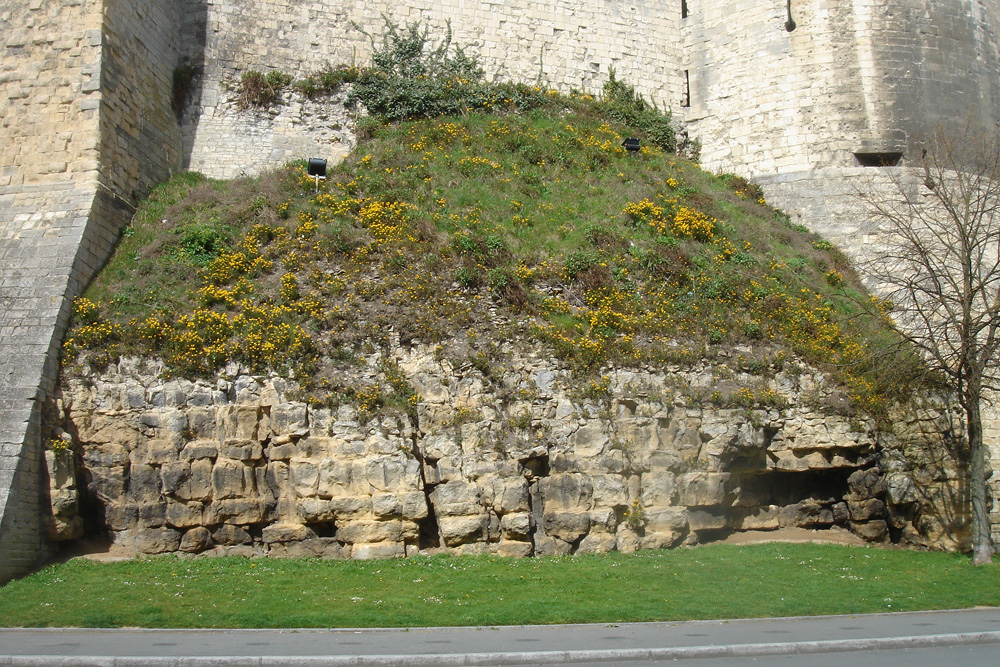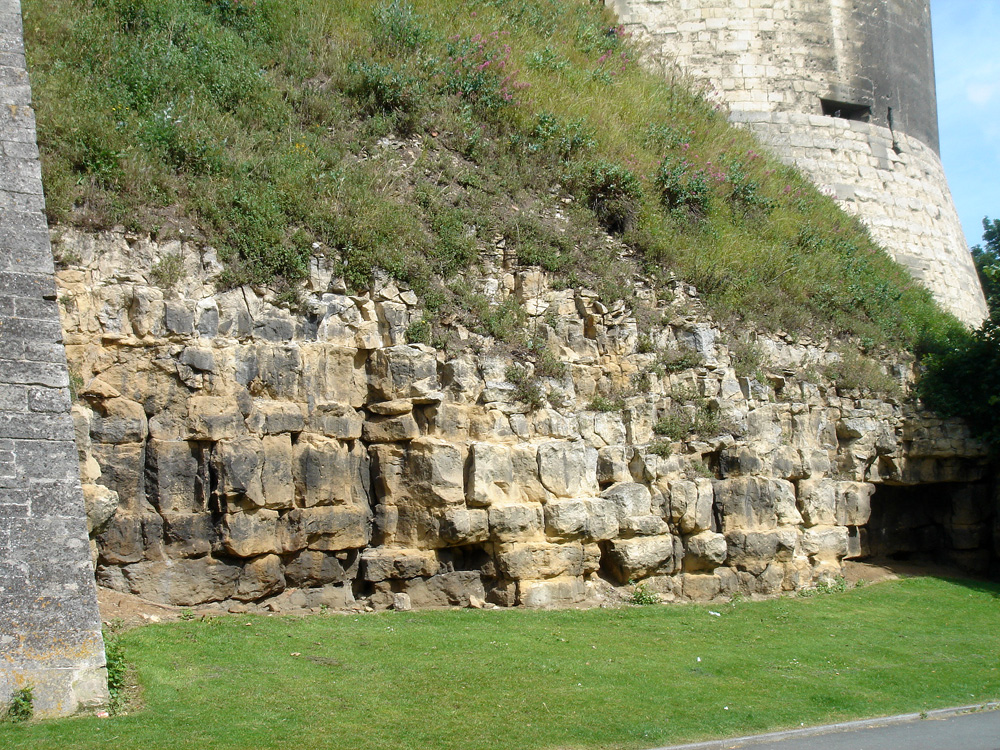 L’affleurement situé entre les deux tours permet d’observer la partie supérieure de la Formation du Calcaire de Caen d’où fut extraite la pierre de Caen utilisée pour la construction du château et de ses remparts. |