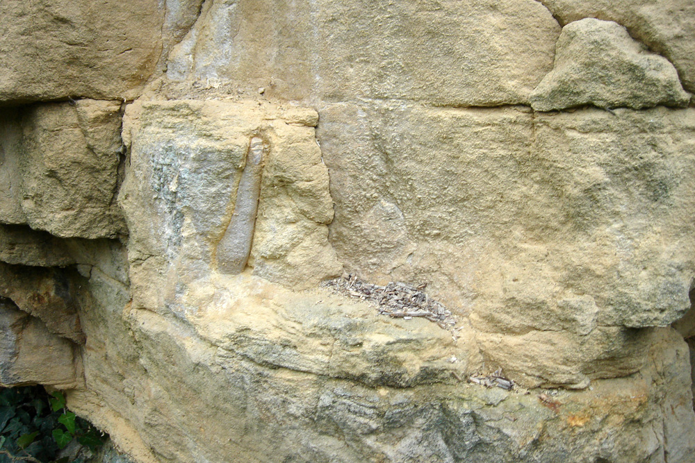 Chevilles siliceuses dans les bancs du sommet du Calcaire de Caen. Elles correspondent à d’anciens terriers ou à des racines silicifiées de végétaux de mangrove.