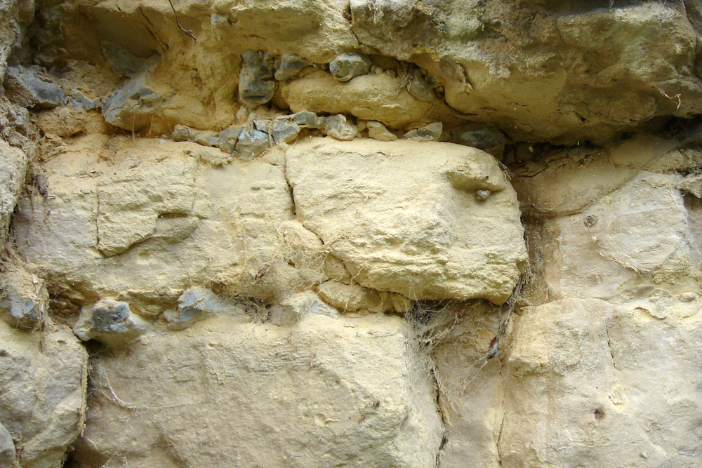 La partie supérieure de la Formation du Calcaire de Caen affleure sous forme de bancs massifs de calcaire à grain fin et de teinte beige clair. Ce calcaire provient de la consolidation d’une boue carbonatée constituée de très fins débris de d’organismes marins (coquilles, spicules d’éponges, squelettes).