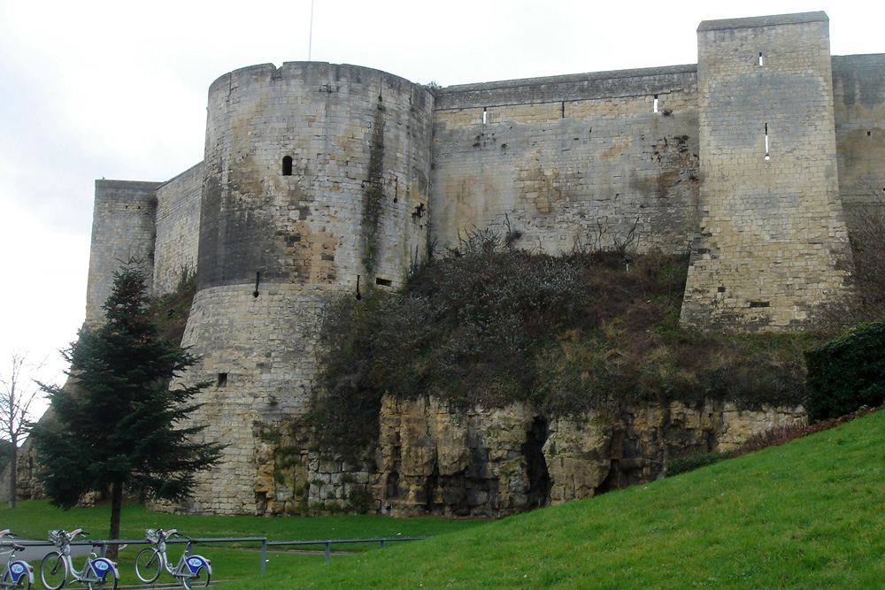 Le Calcaire de Caen affleure dans les fronts de taille qui bordent le fossé Est du château depuis l’avenue de la Libération jusqu’à la Porte des Champs où le passage au Calcaire de Creully est visible.