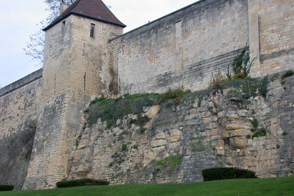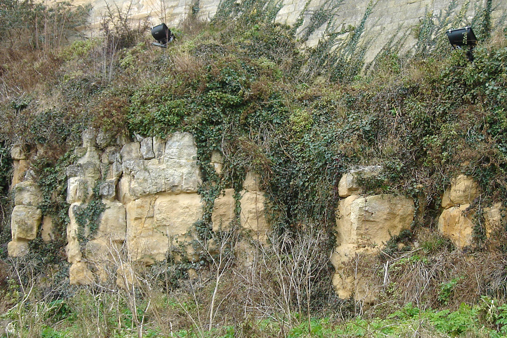 Les bancs massifs du Calcaire de Caen affleurent rue de Géole sous le rempart Sud-Ouest en contrebas du Musée de Normandie. La base de l’escarpement est confortée par un mur de pierre. Les bancs calcaires ont été boulonnés pour lutter contre la décompression et l’affleurement est recouvert d’un grillage de sécurité. |