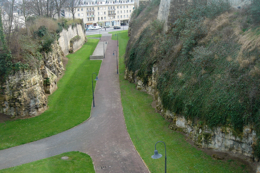 Le Calcaire de Caen affleure aussi sous le rempart Sud-Est jusqu’à la porte Saint-Pierre. Il est en partie recouvert par la végétation.