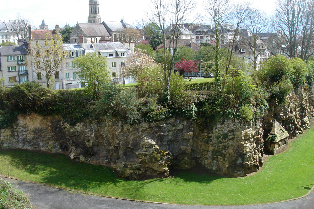 Sous le rempart Est, près de la porte des Champs, l’escarpement présente à son sommet le lit de silex qui surmonte le dernier banc massif de Calcaire de Caen. Au-dessus, les premiers bancs du Calcaire de Creully sont masqués par la végétation.