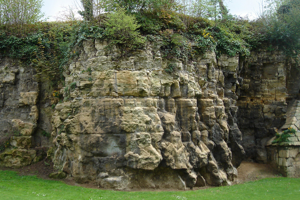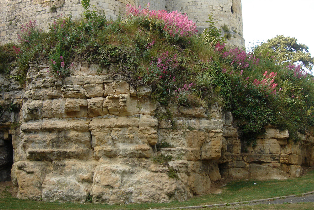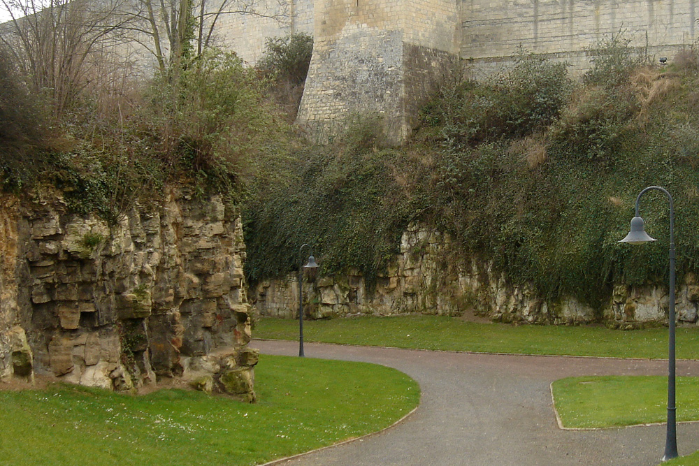 Au sommet des escarpements des fossés du château, le Calcaire de Caen passe progressivement au Calcaire de Creully par enrichissement en accidents siliceux et apparition d’une stratification oblique.