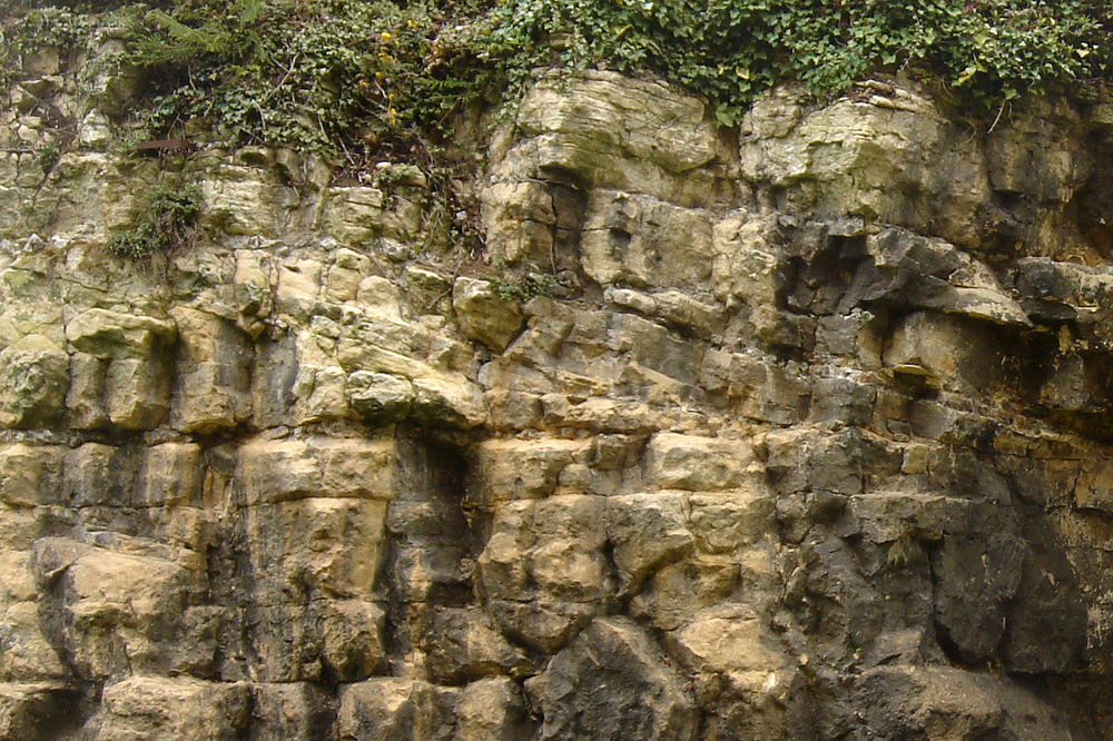 Comme sous la barbacane de la Porte des Champs, l’affleurement expose des bancs de calcairemassifs à sa base et des lits de silex dans sa partie supérieure.