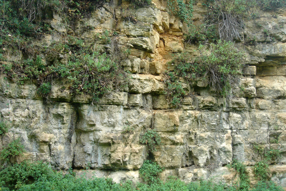 Au-dessus des bancs horizontaux massifs de Calcaire de Caen, le sommet de l’escarpement (souvent couvert de végétation) présente un litage oblique, indice du passage du Calcaire de Caen au Calcaire de Creully.