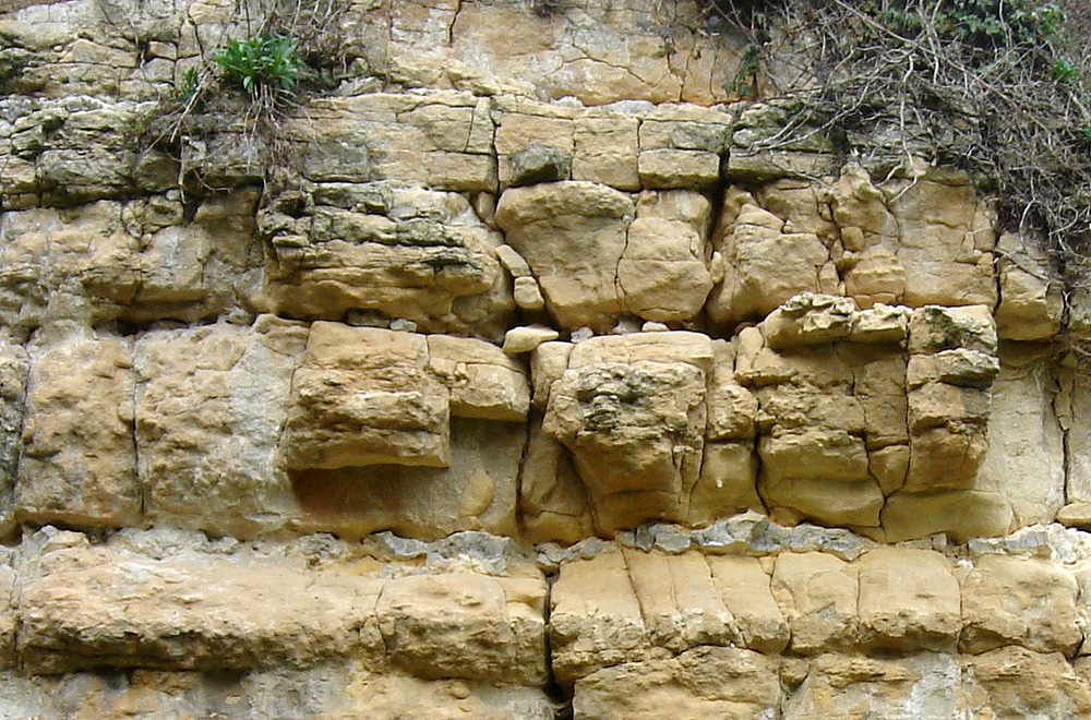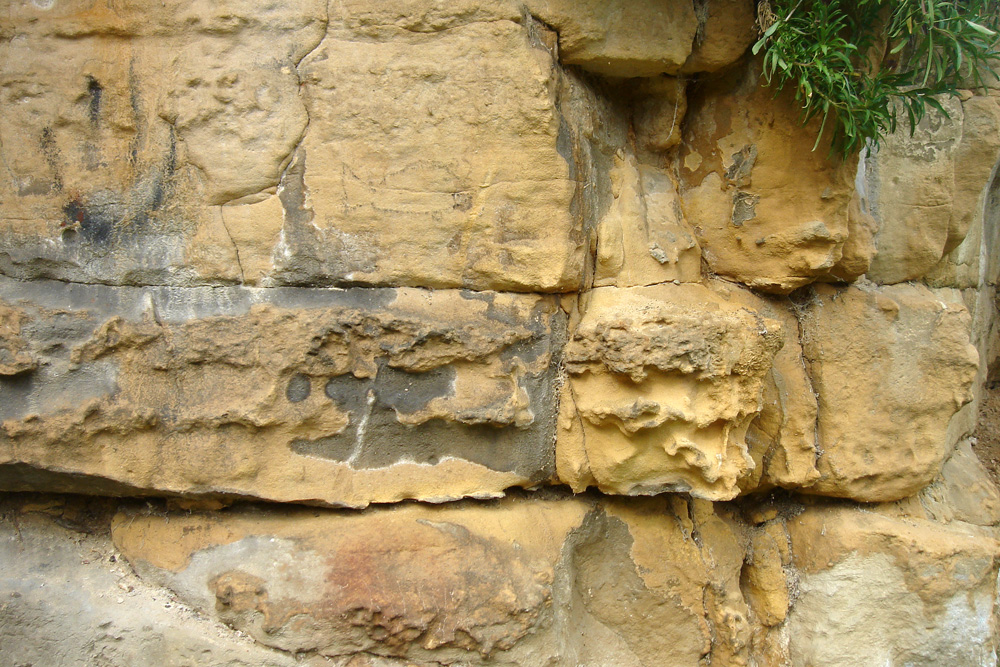Dans ce banc de Calcaire de Caen l’induration du sédiment n’a pas été homogène ; les zones plus dures, mises en relief par l’érosion, correspondent à du sédiment bioturbé (remplissages de terriers et galeries). On retrouve les mêmes figures d’érosion dans les pierres utilisées dans la construction des bâtiments (portail de l’église Saint-Pierre par exemple).