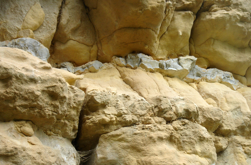 A mi-hauteur de l’escarpement, au-dessus des bancs massifs subhorizontaux du Calcaire de Caen, les calcaires présentent une stratification oblique caractéristique du Calcaire de Creully.