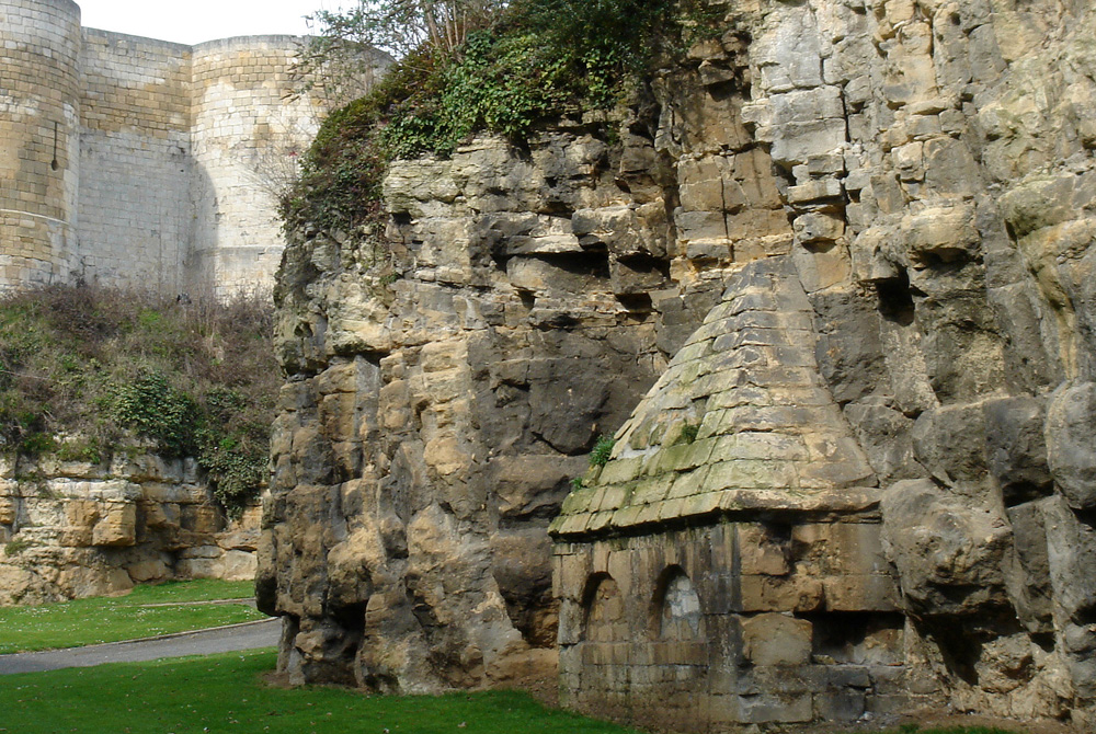 Sous la barbacane de la Porte des Champs, les bancs massifs de la base de l’ancien front de taille appartiennent au sommet du Calcaire de Caen. Ils sont surmontés par des lits de silex et des bancs moins épais qui annoncent le Calcaire de Creully.