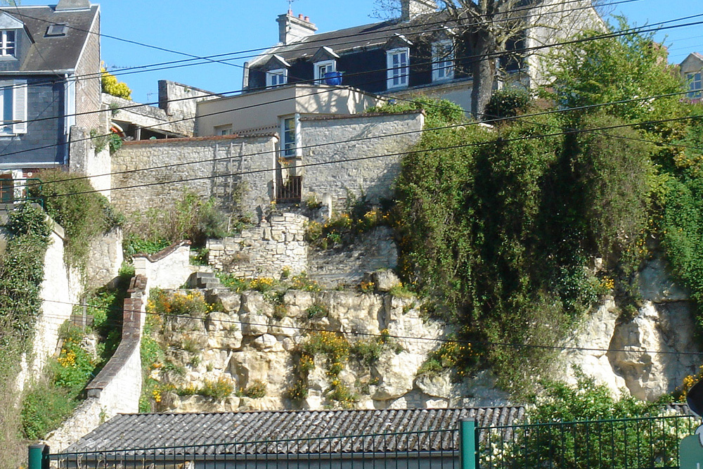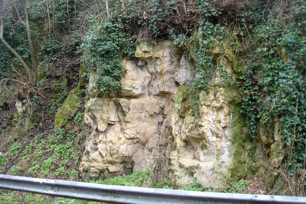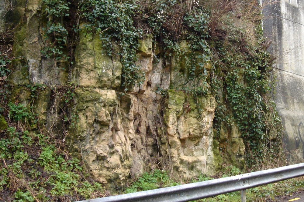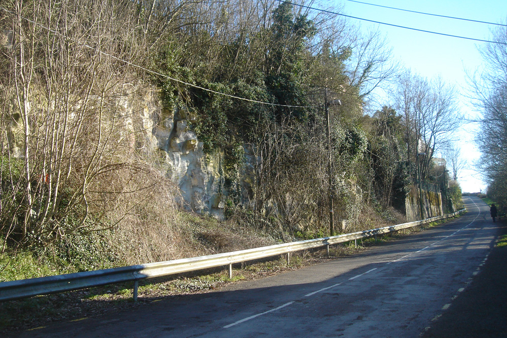 Situé à mi-chemin dans la montée du chemin de la Cavée, cet affleurement n’a pas été cimenté. Les bancs épais et massifs de calcaire correspondent aux niveaux d’extraction de la pierre de Caen. Ici, ils sont très fracturés suite à la décompression due à l’appel au vide après façonnement du front de taille. A proximité, le versant est consolidé par un ouvrage de maçonnerie qui supporte une maison. |