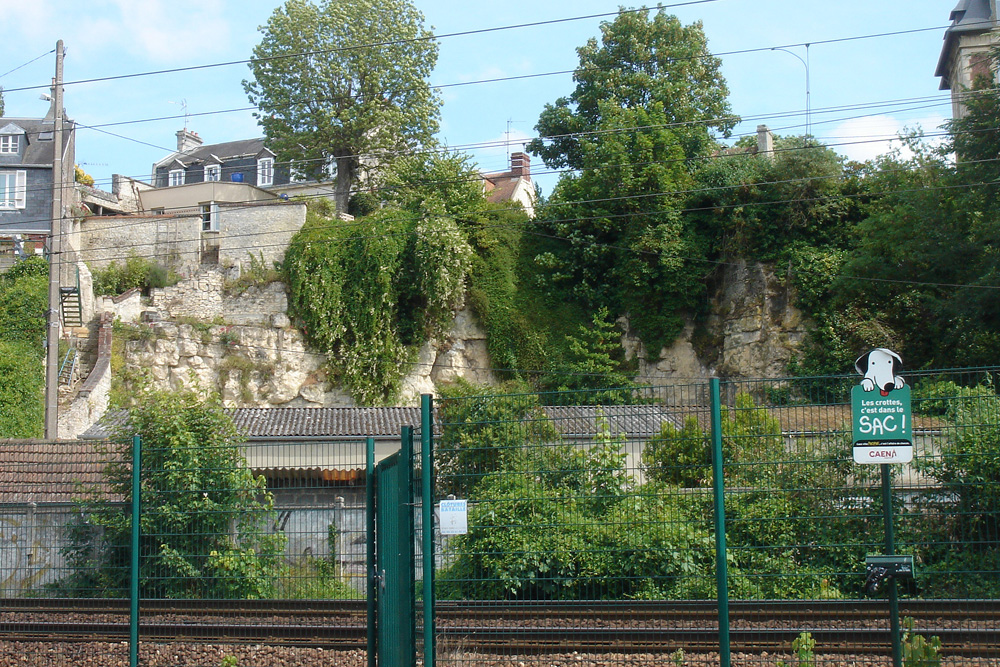 Le coteau, qui présente une dénivellation de 15 m, a été entaillé pour l’extraction de la pierre de Caen ; les anciens fronts de taille sont plus ou moins masqués par les maisons et la végétation. Le coteau longe l’Orne et la voie de chemin de fer Paris - Cherbourg. |