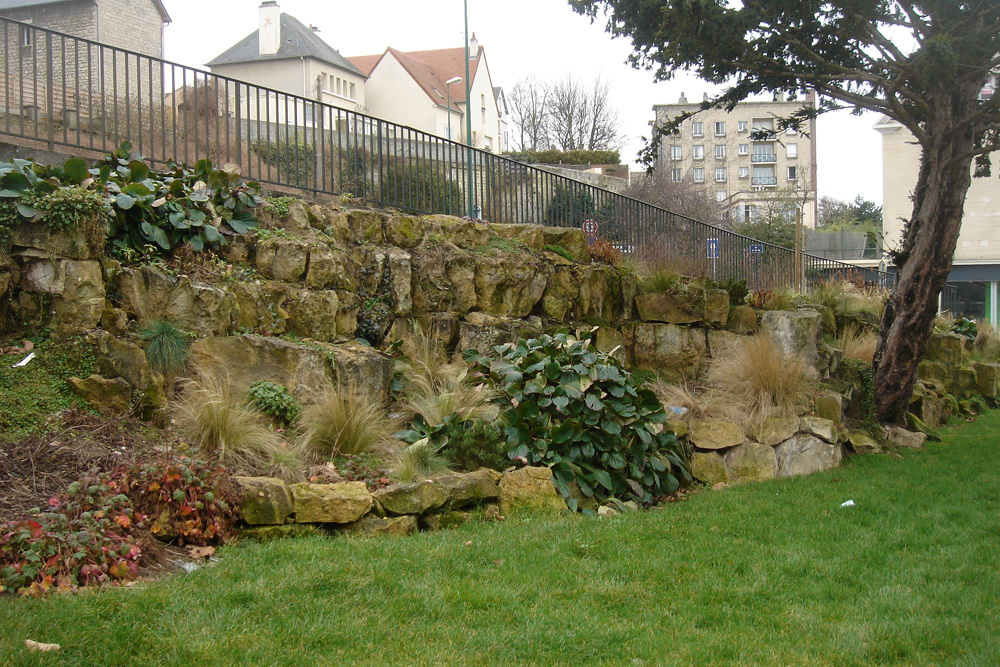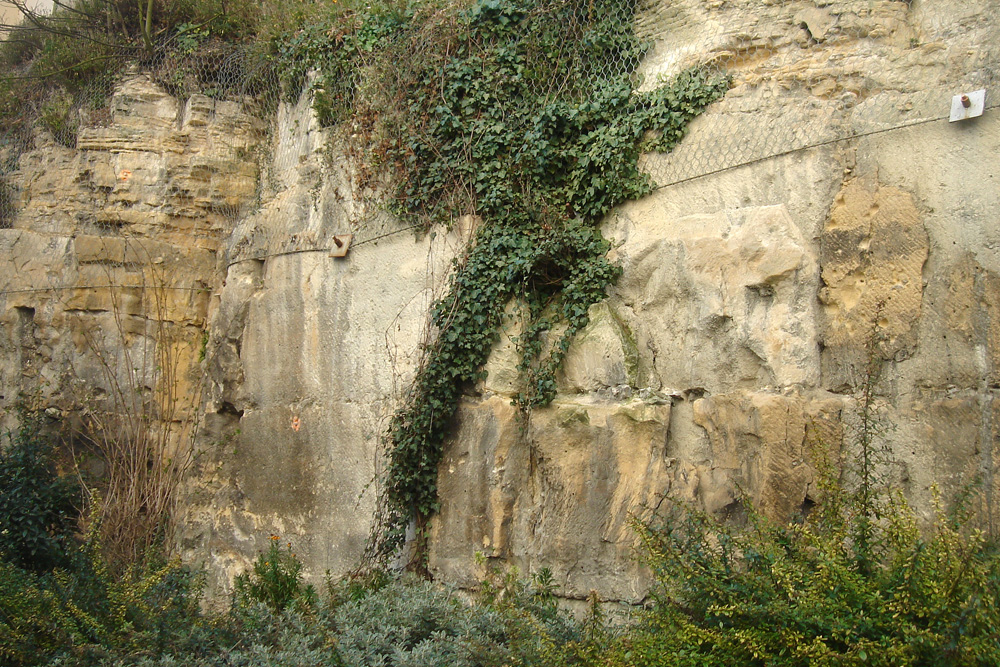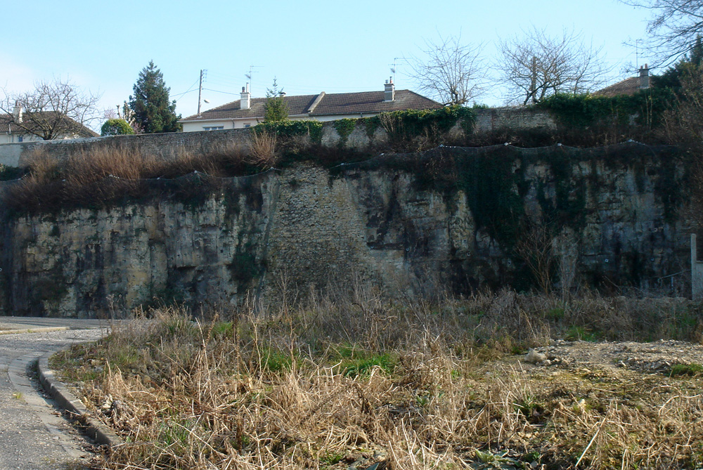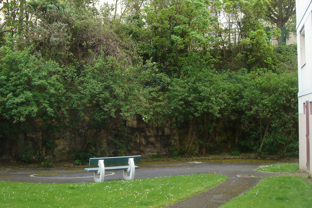 Un ancien front de taille qui a entamé la base du coteau le long de la voie ferrée est visible au fond des jardins des propriétés privées de la rue du Marais. On peut l’apercevoir à travers la grille d’une zone en chantier près du pont de chemin de fer ; les maisons qui le surmontent sont celles de la rue de Trouville. Le front de taille a été consolidé en son milieu par un mur de pierres. |