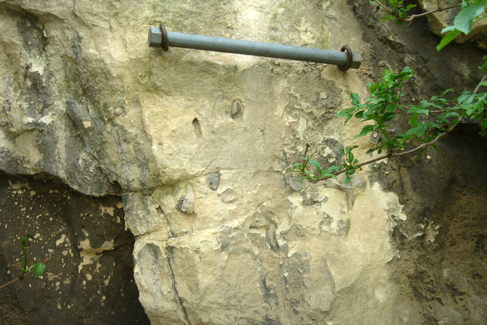 Le front de taille ouest présente une face d’extraction plane portant des traces d’exploitation (stries obliques) ; la Pierre de Caen était extraite de ces bancs massifs. Le sommet du front de taille est boulonné et sécurisé par un grillage de protection.