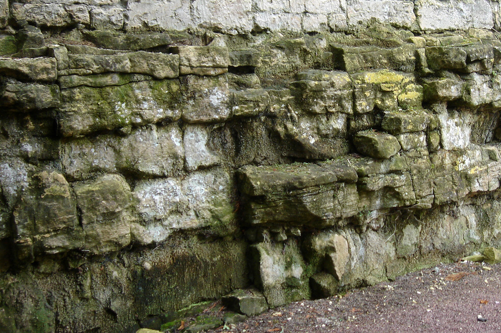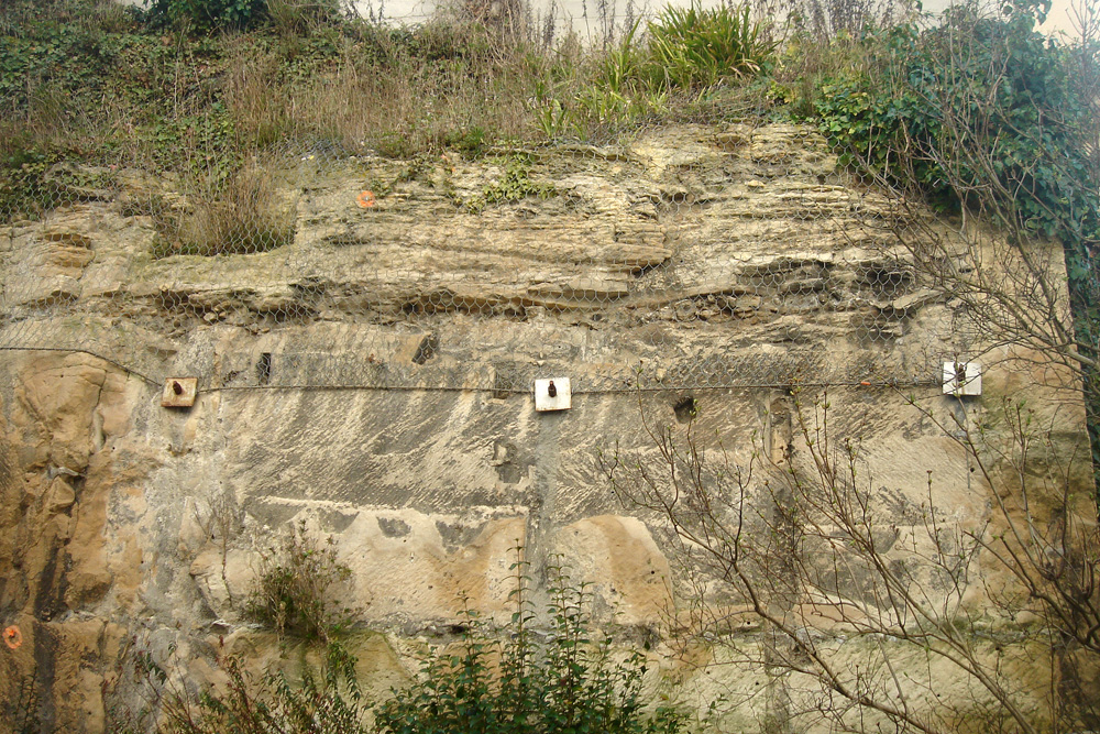 Les bancs massifs de Calcaire de Caen sont surmontés de bancs à litage oblique qui correspondent au début du Calcaire de Creully.