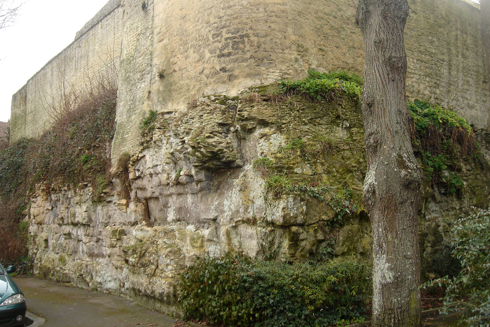 A 200 m de la place de la gare, le Calcaire de Caen affleure à la faveur d’un ancien front de taille rue Père Robert, au pied de l’escalier montant jusqu’à la rue Belvédère.