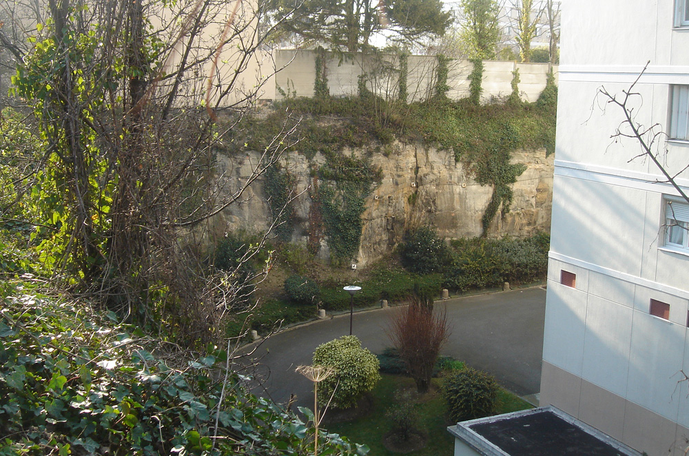 A gauche de l’immeuble, une allée mène au jardin de l’immeuble, bordé par le prolongement du front de taille sud vers l’Est. On accède ainsi aux bancs de la partie supérieure du front de taille.