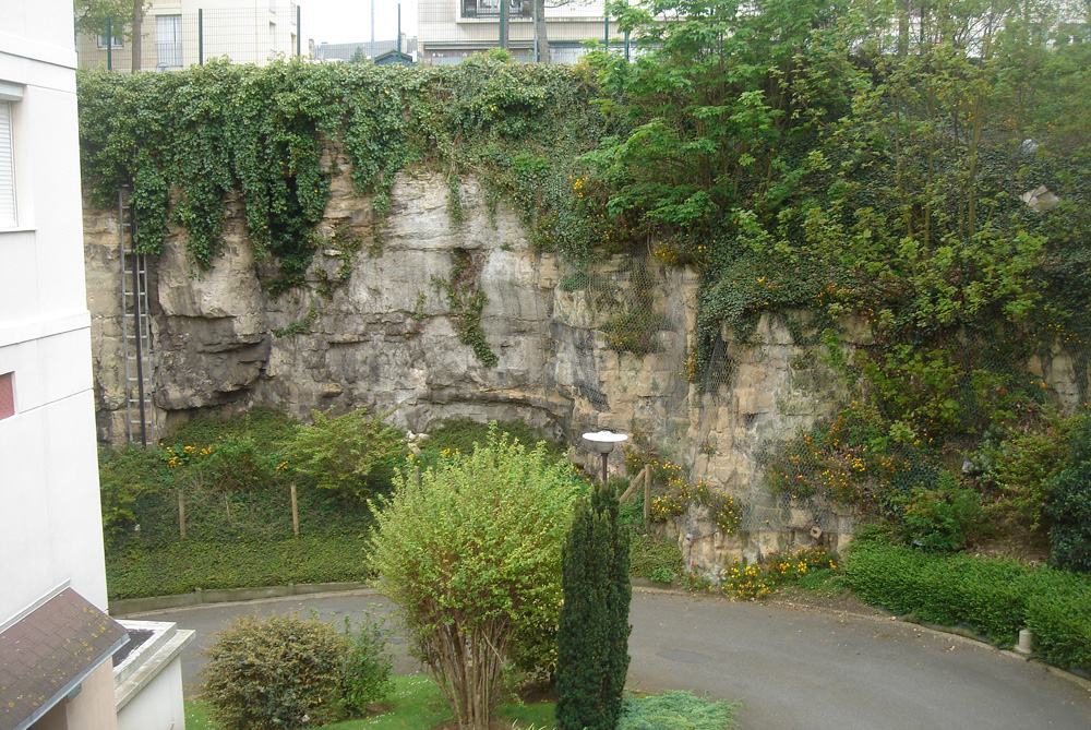Situé derrière l’immeuble, en contrebas du Boulevard Leroy, le front de taille sud présente une succession de bancs massifs sur une hauteur maximale. |