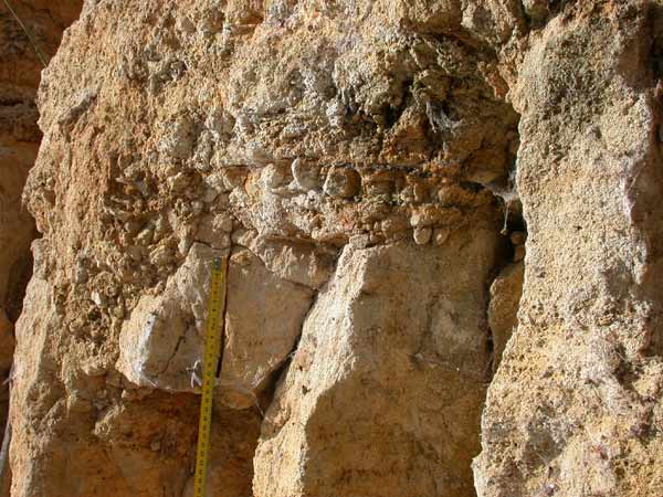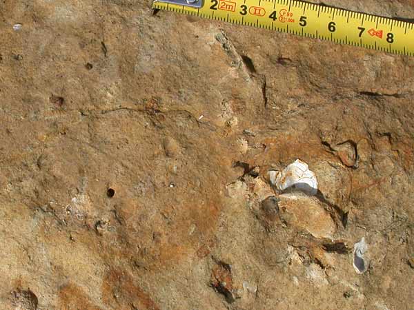 Surface durcie avec coquilles de lamellibranches, perforations, pistes et léger enduit ferrugineux, correspondant à un arrêt de sédimentation. |
