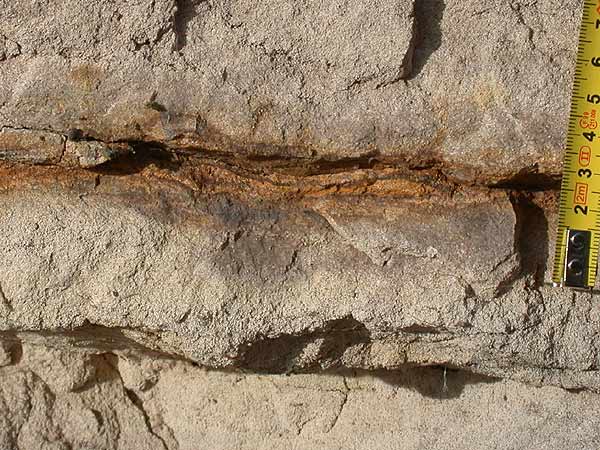 Enduit ferrugineux soulignant une surface durcie dans les calcaires oolithiques, qui témoigne d'un arrêt de sédimentation. |