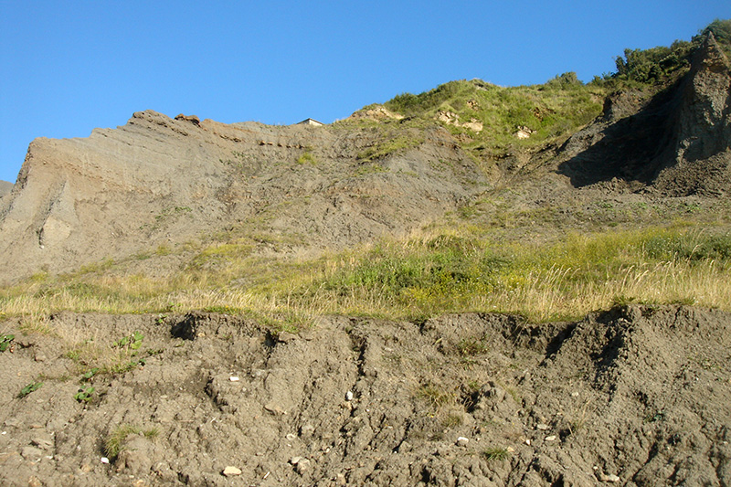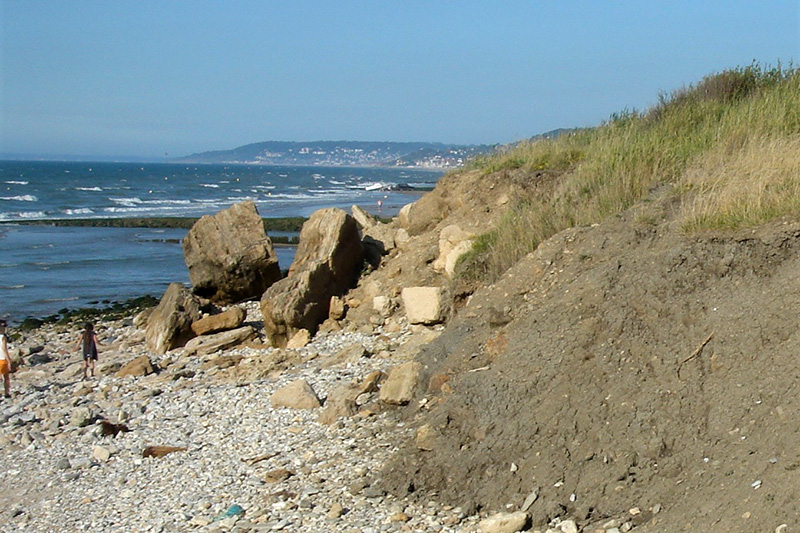 On peut trouver des blocs de calcaire du Coral Rag parmi les nombreux blocs éboulés apportés sur la plage par les coulées de boue.