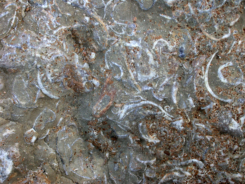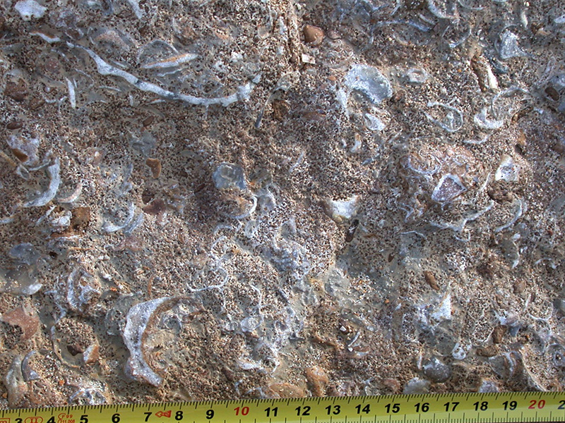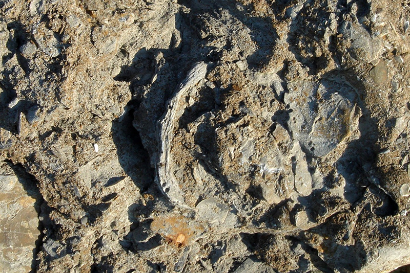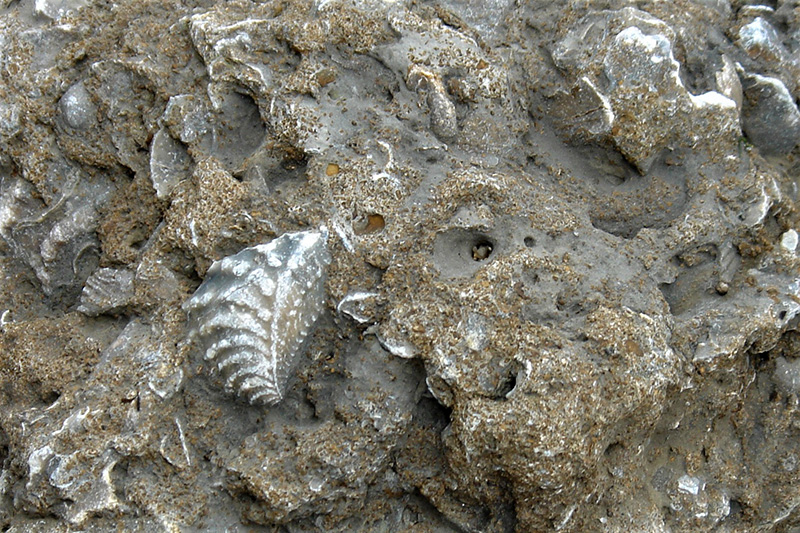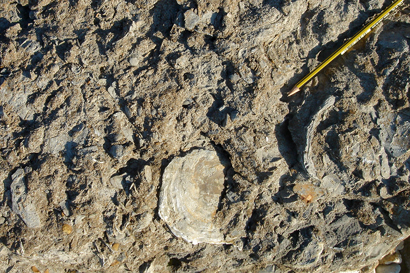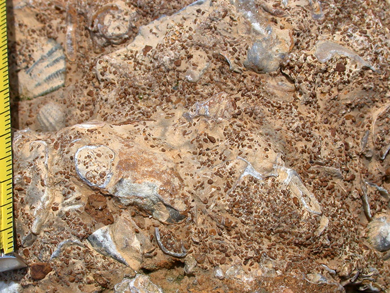 De nombreux fragments de coquilles de bivalves sont enrobés dans une matrice micritique à grains ferrugineux.