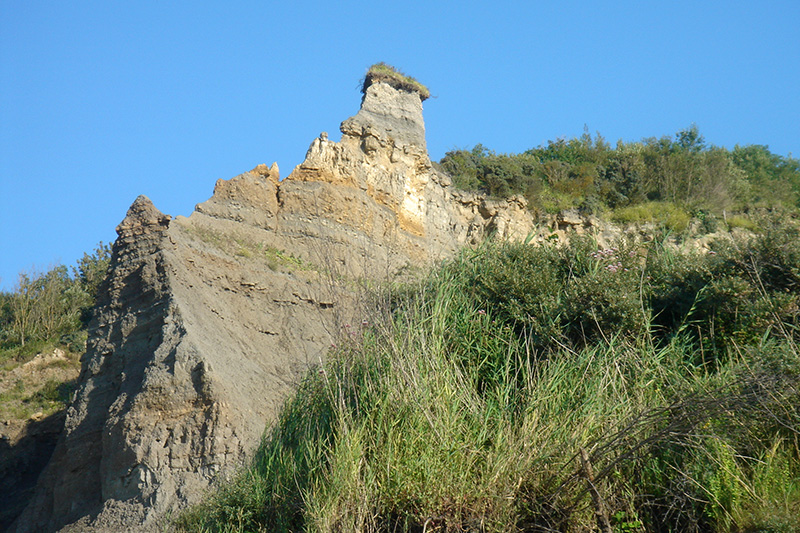 Position du Calcaire d’Auberville dans la falaise des Vaches Noires A mi-hauteur des falaises, une « petite cheminée de fée » dégagée par l’érosion est coiffé par la base du Calcaire d’Auberville.