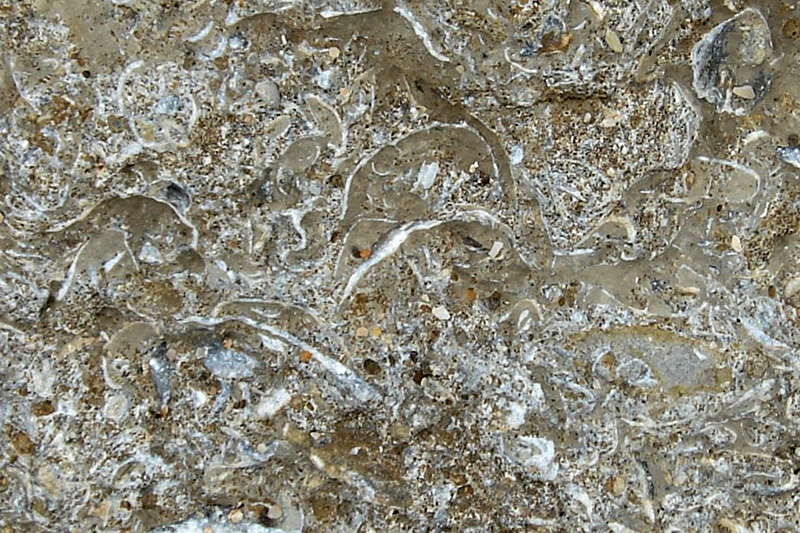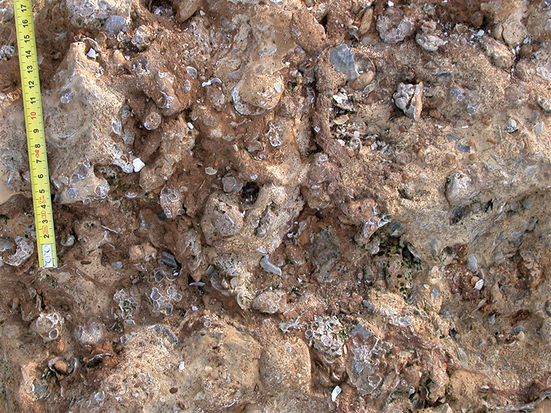 Bioclastes au sein d'une matrice à forte densité de grains ferrugineux dont la présence caractérise la formation du Calcaire d’Auberville.