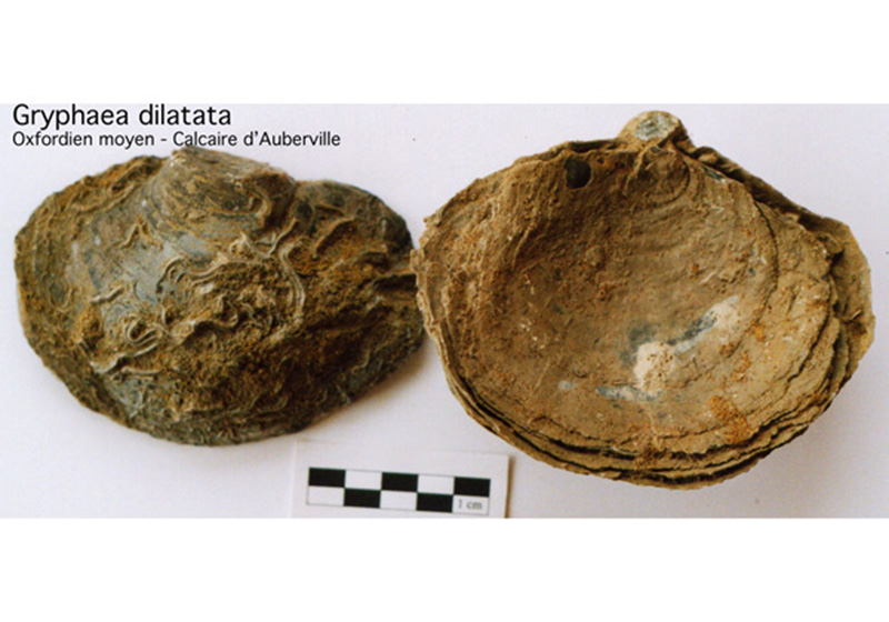 Le Calcaire d’Auberville renferme aussi de grandes huîtres aplaties appartenant à l’espèce Gryphaea dilatata